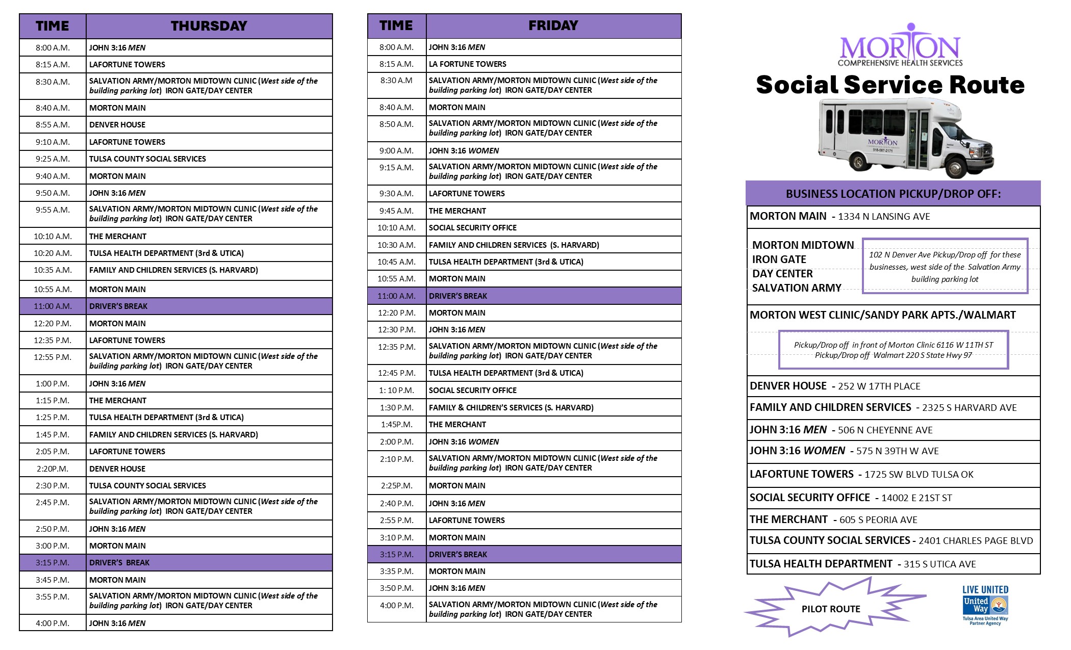 Experience Morton’s safe and convenient curb-to-curb transportation services. Transportation provides rides to designated senior nutrition sites and to social service agencies in the Tulsa area as well. Most buses and vans are lift equipped. If you need a ride to your next Morton medical appointment, please call (918) 587-2171.